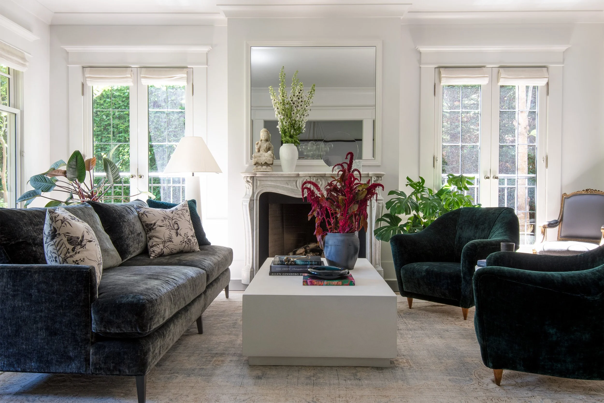 The design focuses on the strategic integration of existing foundations and new acquisitions within this North Capitol Hill home. In the entry, we paired antique French dining chairs with a modern concrete table and a contemporary chandelier to create an immediate dialogue between eras. This layering continues in the living room, where a retained velvet sofa sits alongside French mid-century armchairs and a minimalist white concrete coffee table.